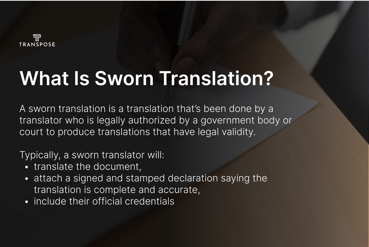 A sworn translation is an official translation used for legal or administrative purposes. You may also hear it called a public or official translation, depending on the country.